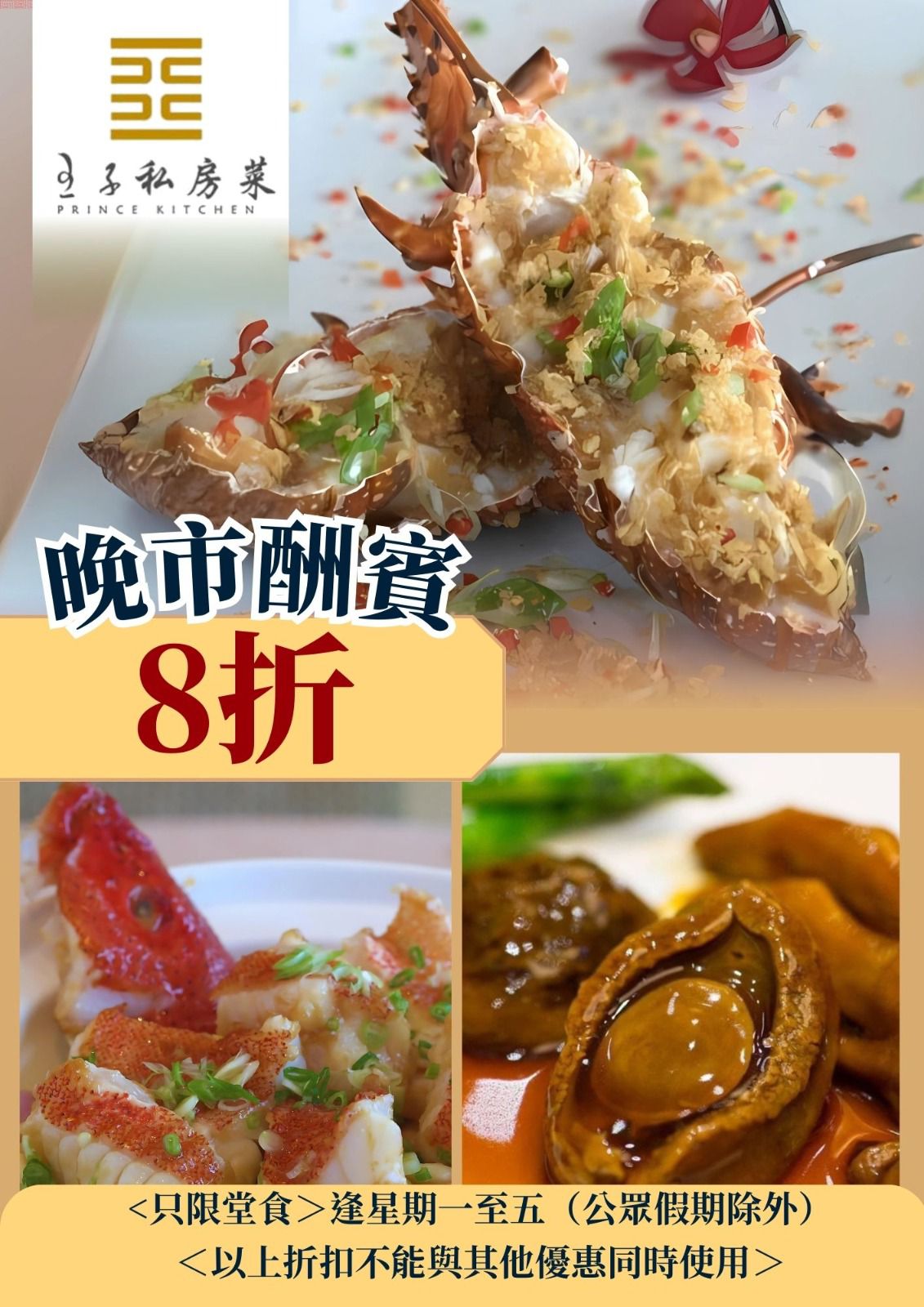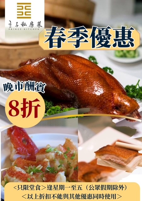 王子飯店以精品粵菜為主打,供應即叫即蒸的美味點心,堅持採用優質食材,健康烹調,將粤式菜餚的營養融合在一起,並提供鮑、參、翅、肚、燕以原汁原味的原則烹調。環境優雅舒適,設有多間獨立貴賓房間,適合商務宴請,朋友聚會。我們堅持出品絕不使用味精及人造色素、即叫即製及採用健康優質的食材以確保為客人帶來不一樣的用餐體驗。